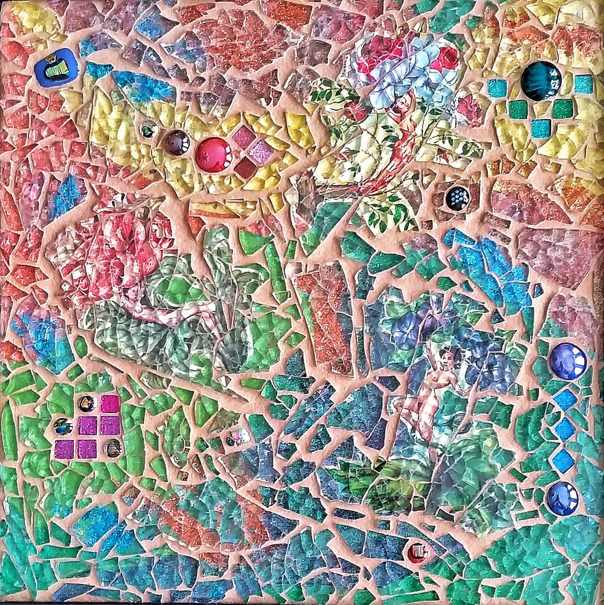 20150917_112000-01 September 18, 2015 • 1775 × 1778 • The Centre for the Arts Gallery, Bristol Pa Victorian Flowers – Rose, Lily and Violet – Glass Mosaic with Decoupage Victorian Postcards 12″ x 12″ $400.00. Ebony frame